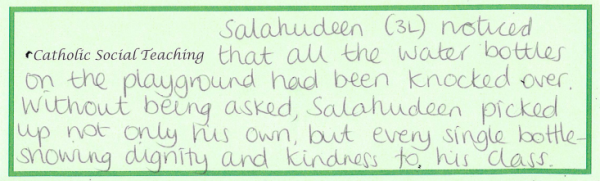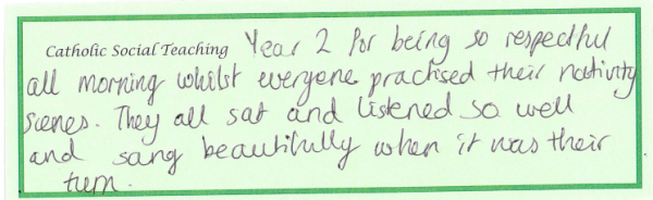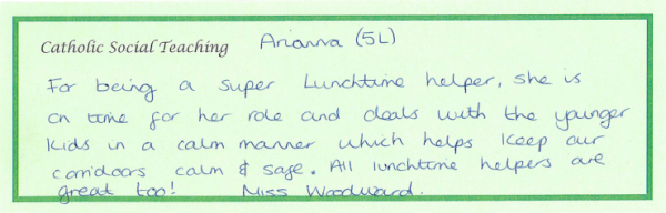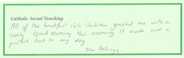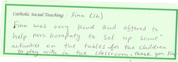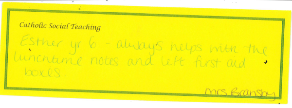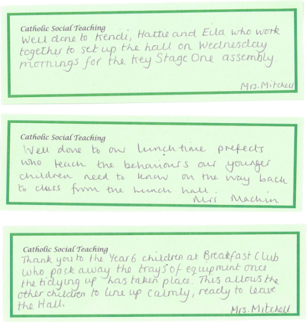 At our school, Catholic Social Teaching is at the heart of how we live and learn together. Launched last year, this whole-school focus helps our children understand that faith is not only something we learn about, but something we live out through our words and actions each day. Each term, we focus on one key aspect of Catholic Social Teaching, giving pupils and staff a clear, shared value to reflect on and practise. When a member of staff notices a child living out that term’s focus, the child’s name and action are written on a slip and placed on the altar, where they are shared and celebrated during our Friday Celebration Assembly.