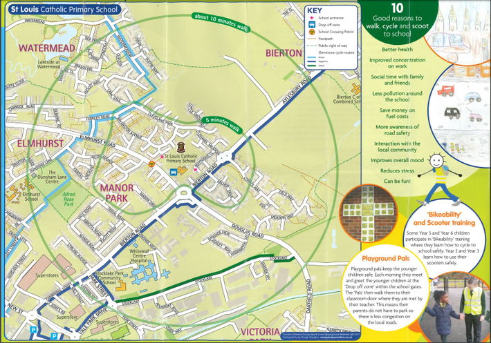 We understand that sometimes there is no alternative to driving to school. Where a car must be used we ask parents to drive only part of the way, and drop their child(ren) off away from the school so that some of the journey can be walked or scooted. We have a 5 / 10 minute walk zone marked on our walking map (below).